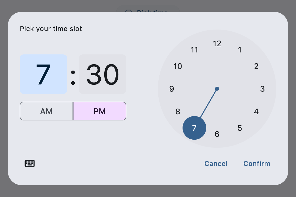 barrier_color- The color of the modal barrier that darkens everything below this picker's dialog.cancel_text- The text that is displayed on the cancel button.confirm_text- The text that is displayed on the confirm button.entry_mode- The initial mode of time entry method for this picker.error_invalid_text- The error message displayed below the input text field if the input is not a valid hour/minute.help_text- The text that is displayed at the top of the header.hour_format- Defines the hour format of this time picker.hour_label_text- The text that is displayed below the hour input text field.locale- The locale for this time picker dialog.minute_label_text- The text that is displayed below the minute input text field.modal- Whether this picker cannot be dismissed by clicking the area outside of it.orientation- The orientation of the dialog when displayed.switch_to_input_icon- The icon displayed in the corner of this picker's dialog when entry_mode is flet.TimePickerEntryMode.DIAL.switch_to_timer_icon- The icon displayed in the corner of this picker's dialog when entry_mode is flet.TimePickerEntryMode.INPUT.value- The selected time that this picker should display.